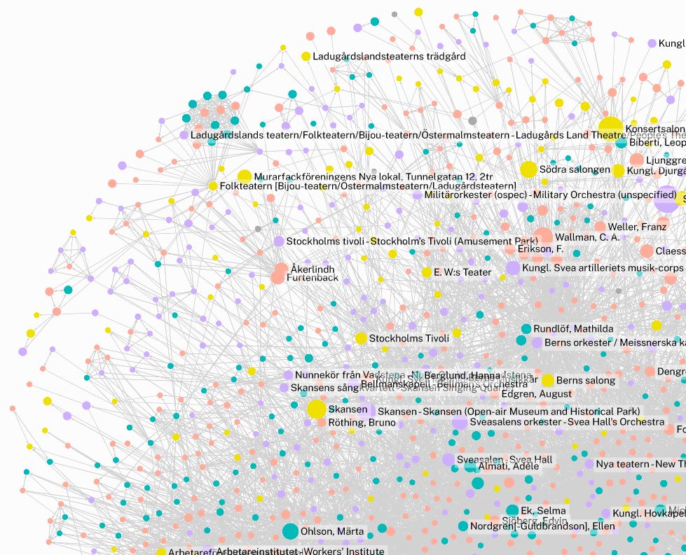 Discover a novel visualization method developed within the “Canon and Concert Life” project, shedding light on the intricate structures of concert culture. Through network analysis, we explore the collaborative web of actors and venues. With over 2500 nodes and 43,600 edges, our Stockholm Concert Database offers a comprehensive glimpse into the dynamic world of musical events and performances.